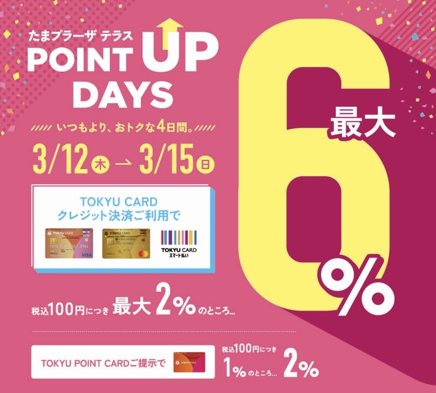 TOKYU POINT CARDは税込100円につき2%、TOKYU CARDでクレジット払いなら税込100円につき最大6%貯まります。毎月9日テラスの日で覚えていただけると嬉しいです。