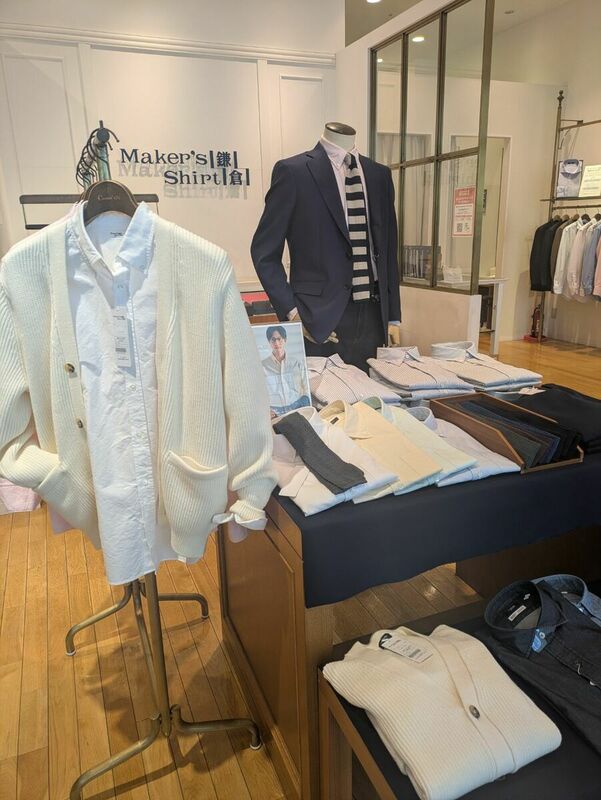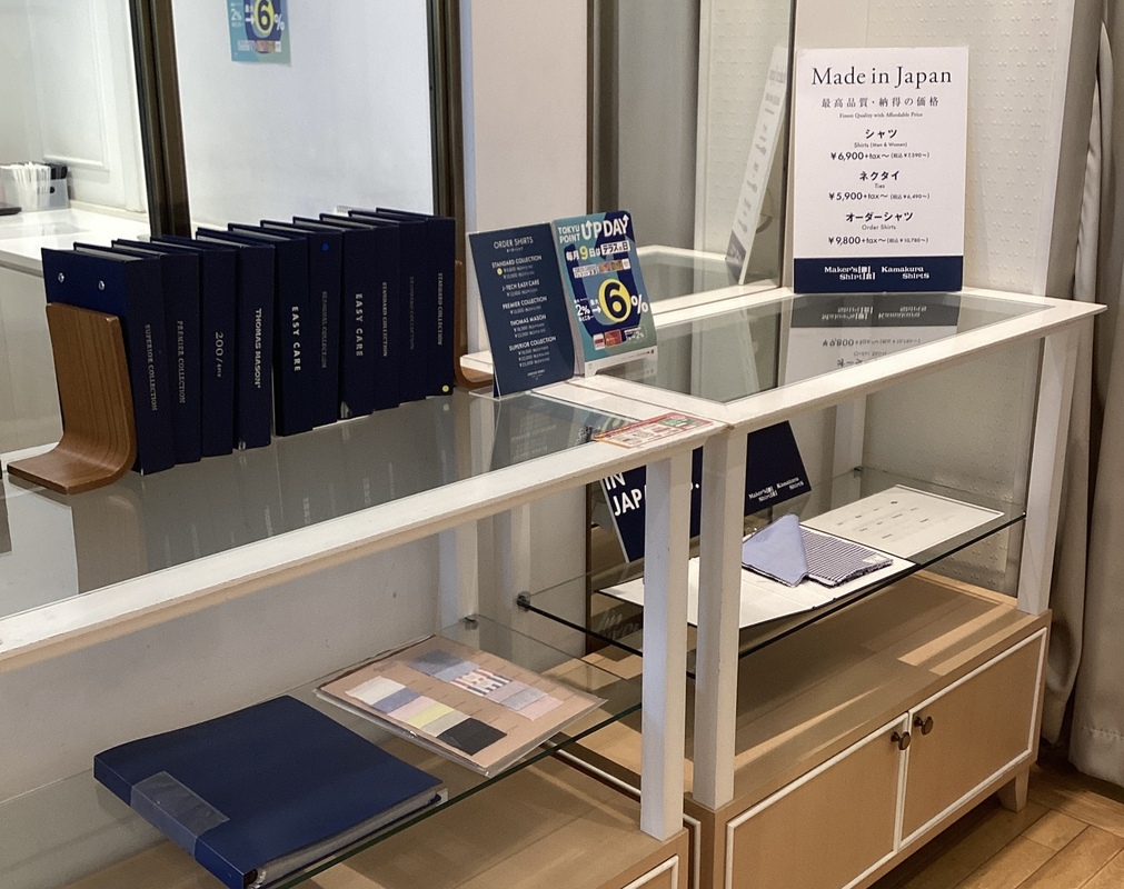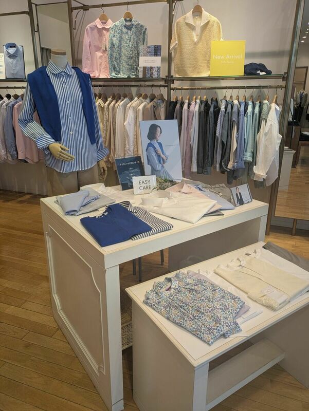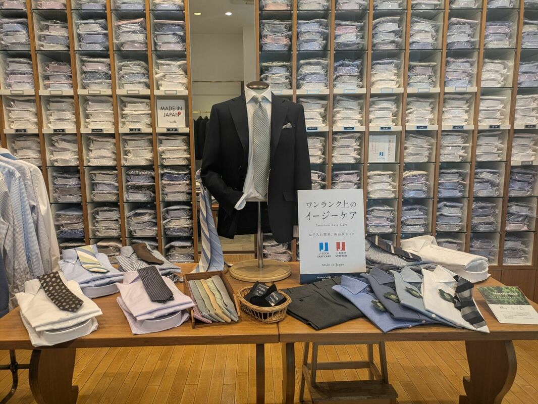 メンズではたまプラーザテラス売り上げの半分以上を占めるイージーケアシャツ。店頭右側がストレッチシャツ、左側棚半分側がPALPAシャツでご用意しております。