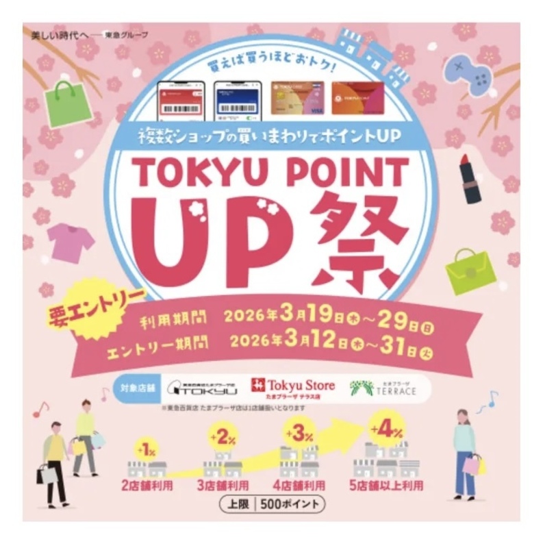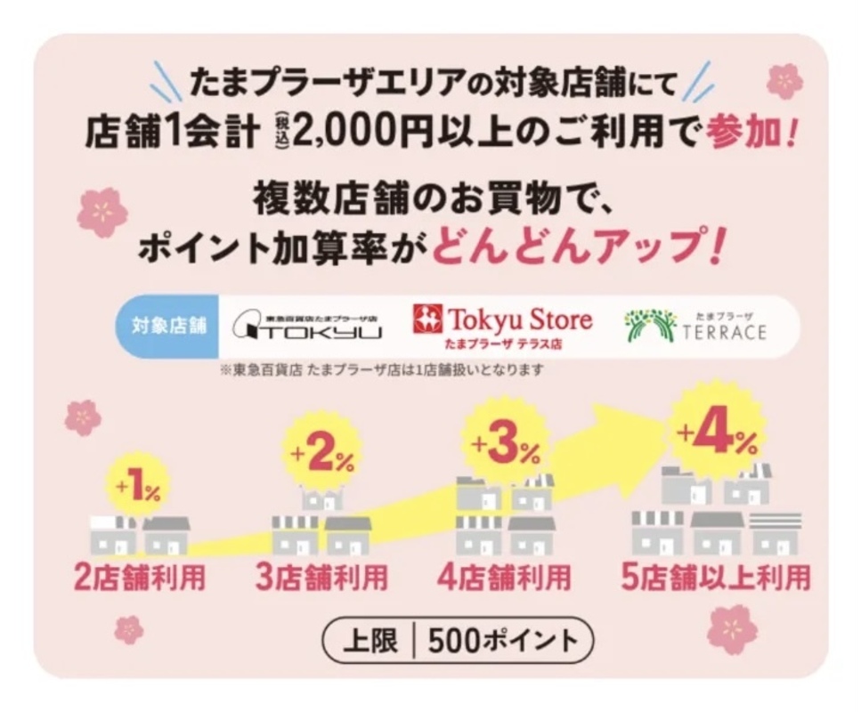 1会計2,000円以上の買い物を2店舗利用で+1%、3店舗利用で+2%、4店舗ご利用で+3%、5店舗以上ご利用で+4%の最大+4%の上限500ポイントを進呈です