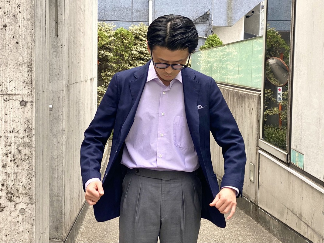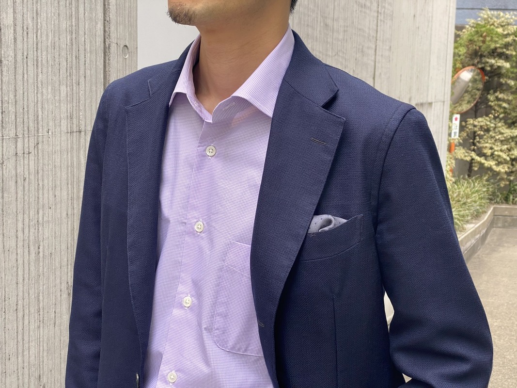 ジャケットを羽織っても襟先がラペルの中にきれいに収まるため、