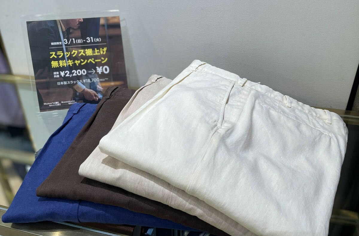 2026年3月1日(日)~2026年3月31日(火)まで、 全店でスラックス裾上げ無料キャンペーンを開催しております!