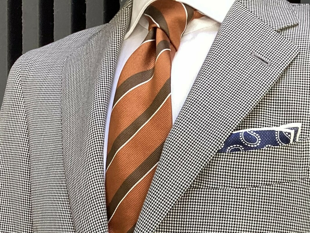 さりげなく個性を出せるオレンジ色ベースに、ブラウン・ホワイトのストライプタイ。