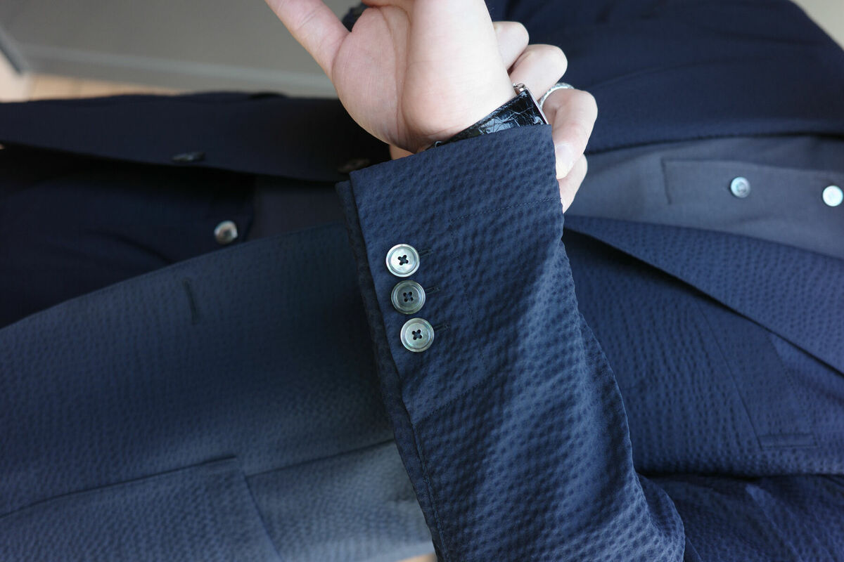 ジャケットの袖口には貝の飾りボタン付き。