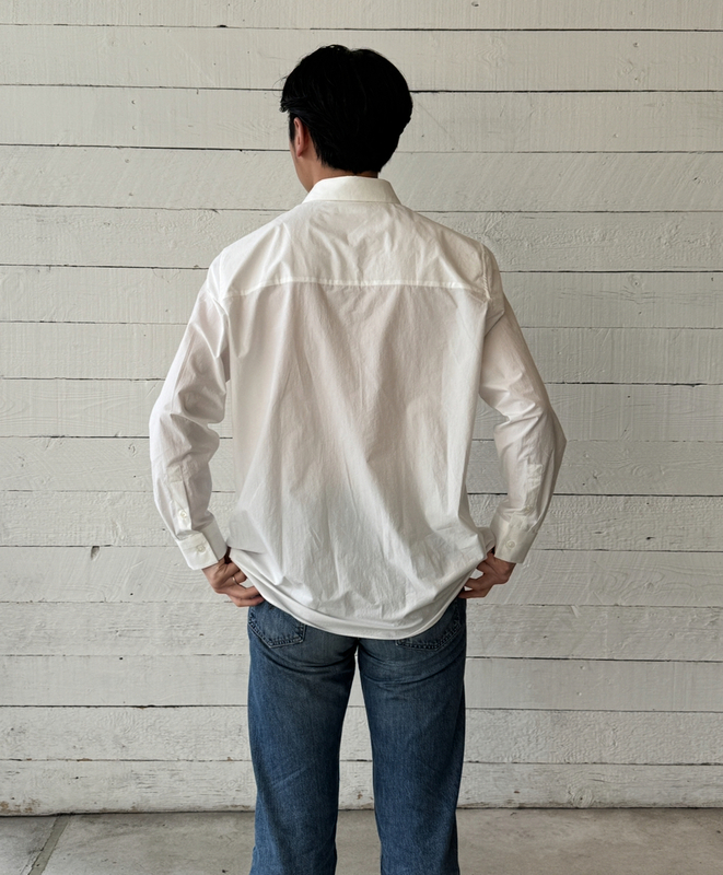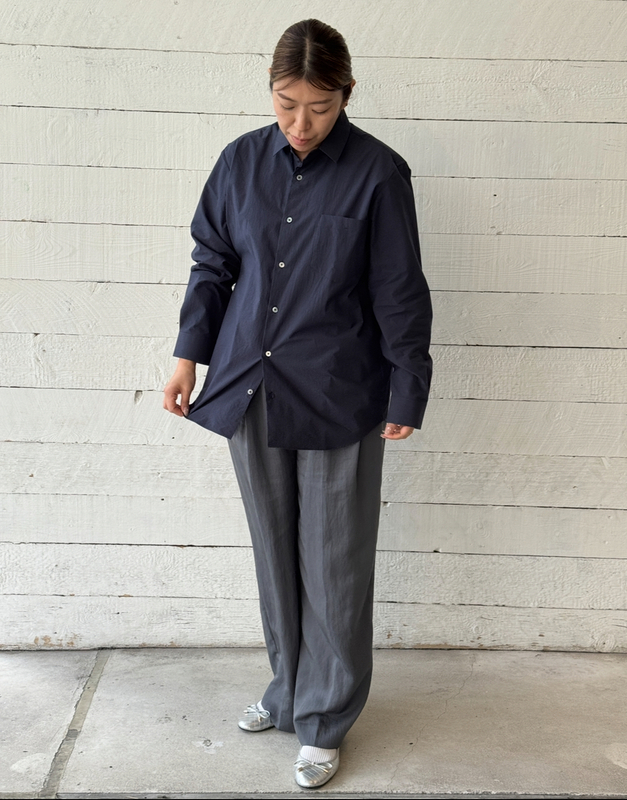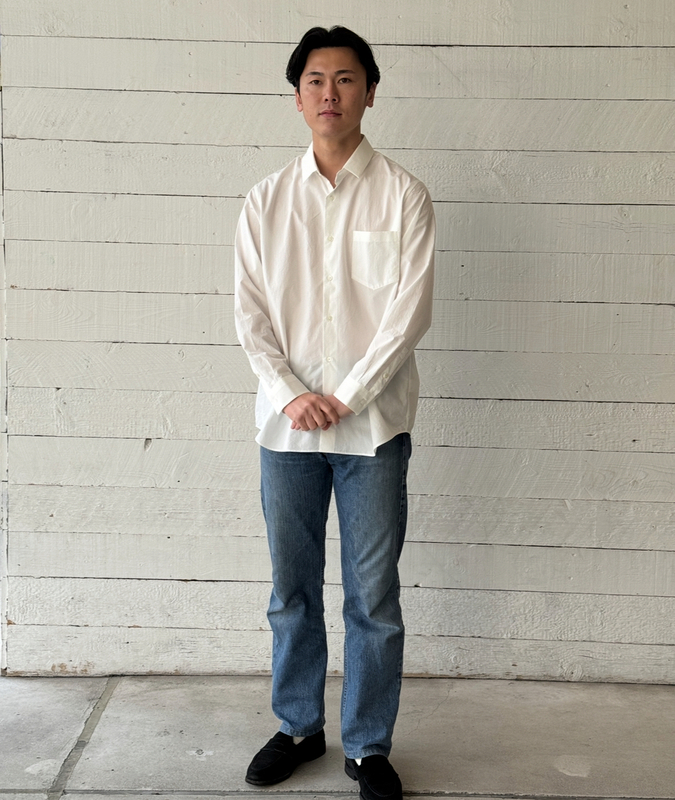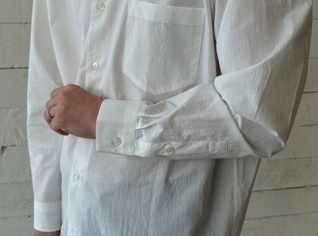 滋賀県で古くから伝わる伝統的な加工技法でじっくりと繊維をもみほぐすことで得られる味わいのあるシワ感が特徴のシャツ。