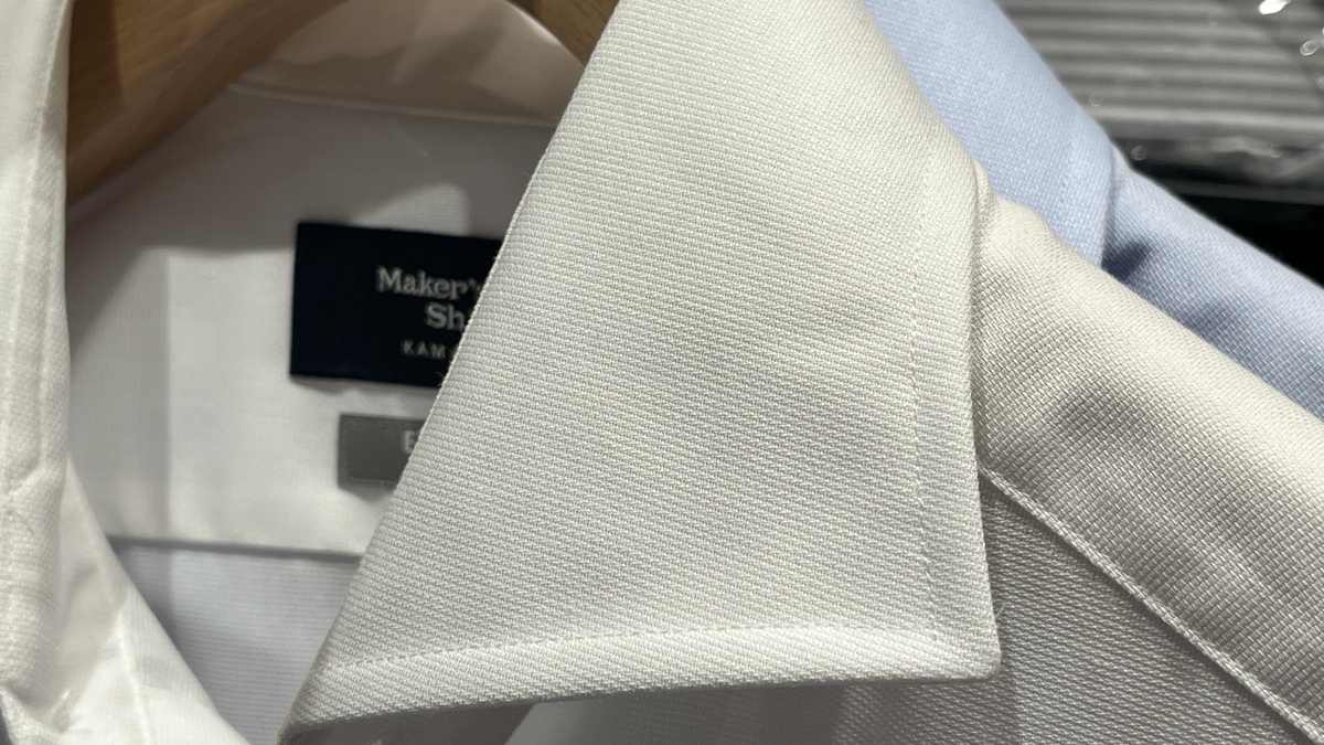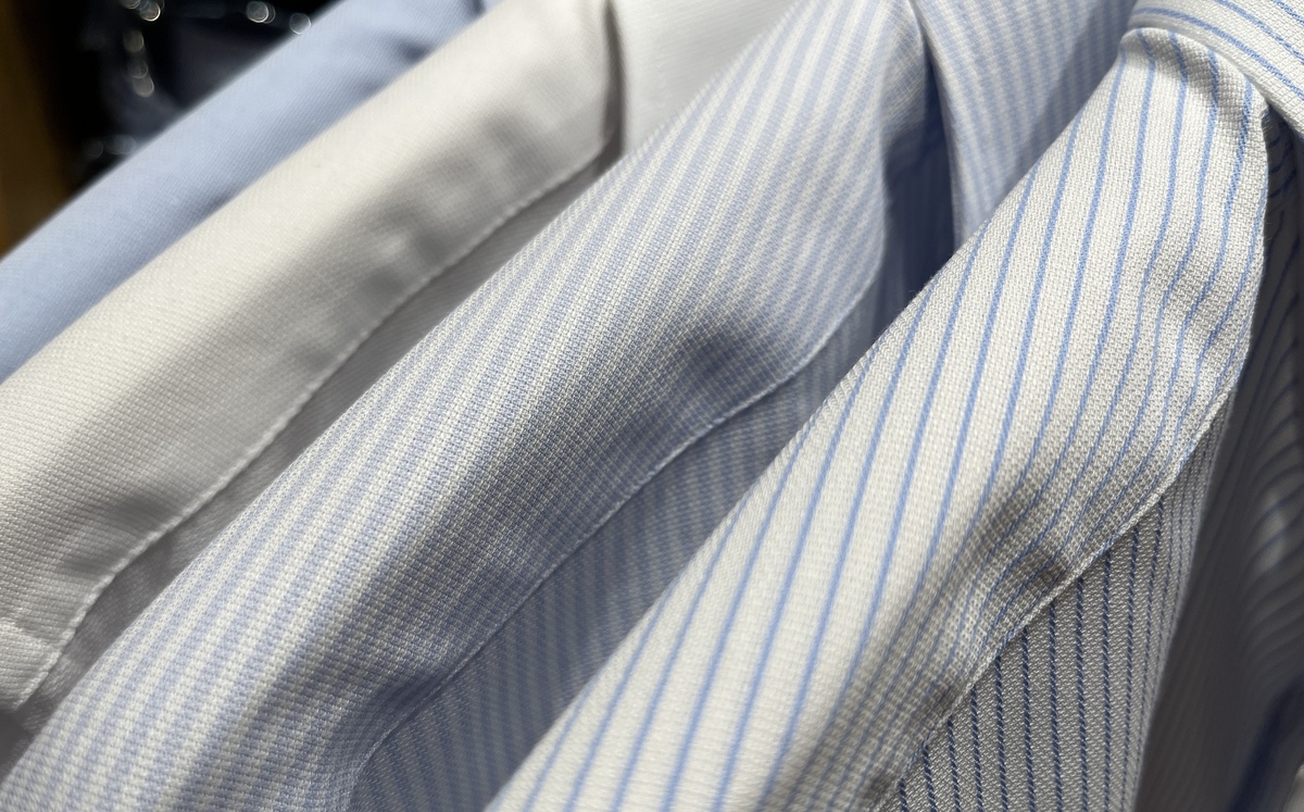 シワがいきにくいという 特徴を持ちながら、 綿を巻きつけた糸を使っているので 見た目は綿100%のシャツという いいとこ取りのシャツになっております。